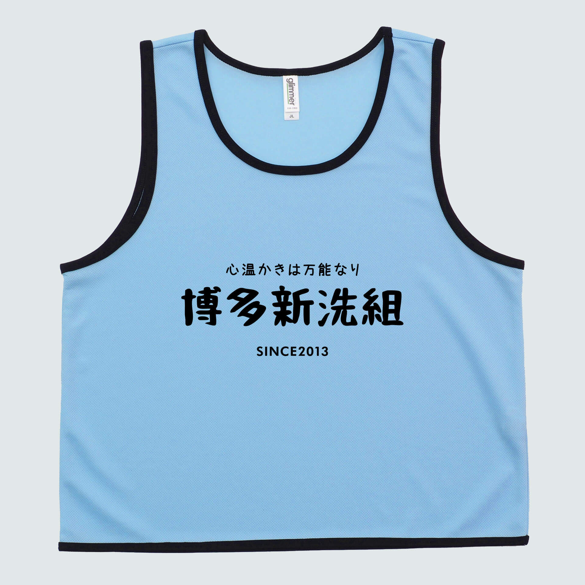 団体の公式ロゴをメインに目立たせつつ、スローガンや設立年度を組み合わせ、情報を整理しつつも全体的に美しく見えるようなビブスに仕上げました。